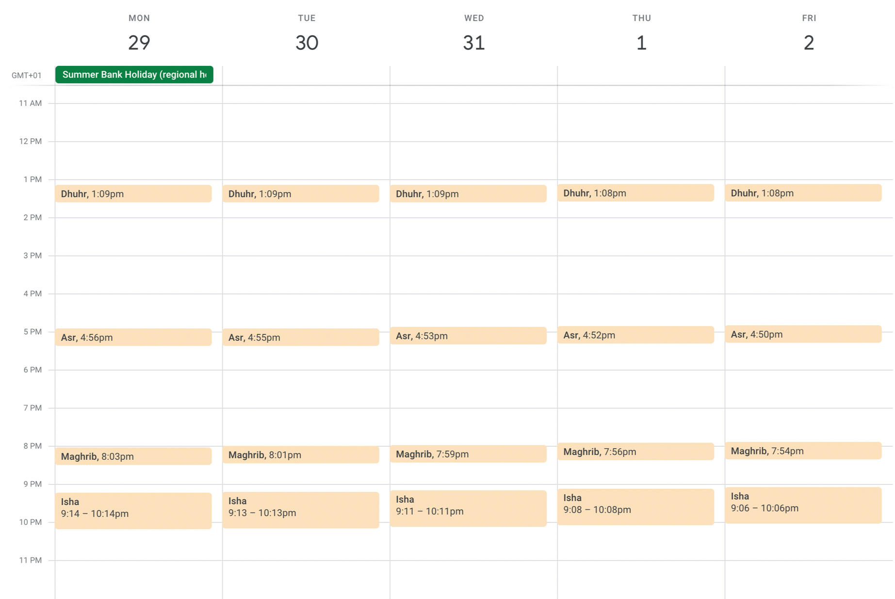 Add custom prayer time-blocks to your Google and Outlook calendars.