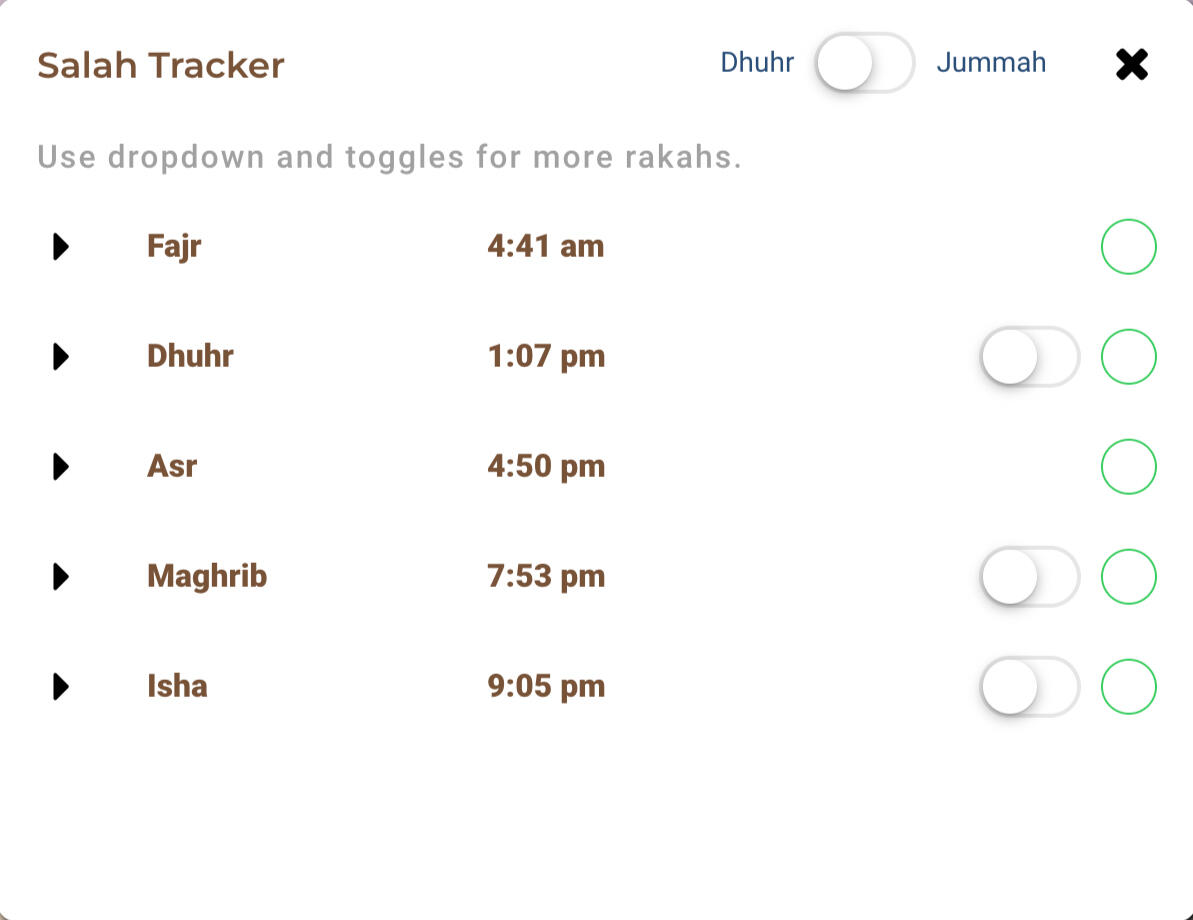 Your tracker includes fard, sunnah, and nafl rakahs, alongside options for Witr and Jummah.
